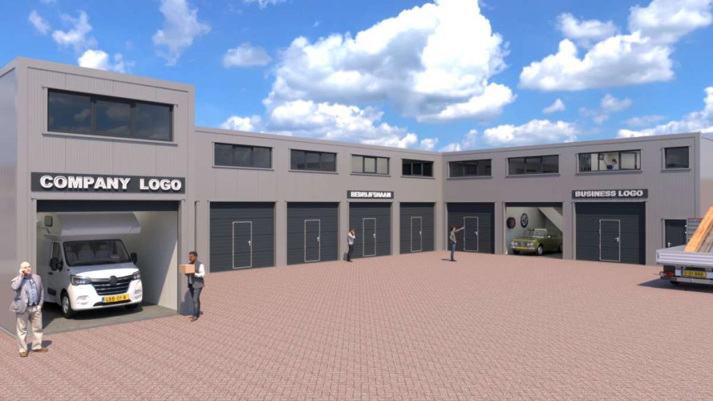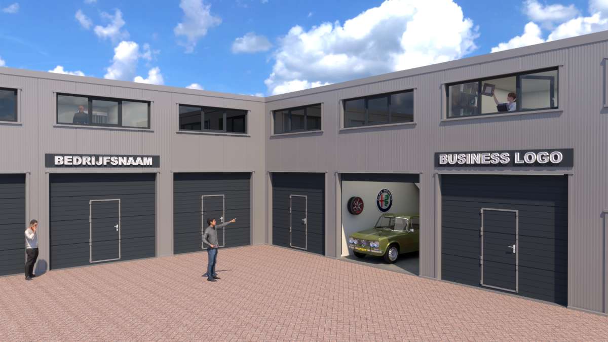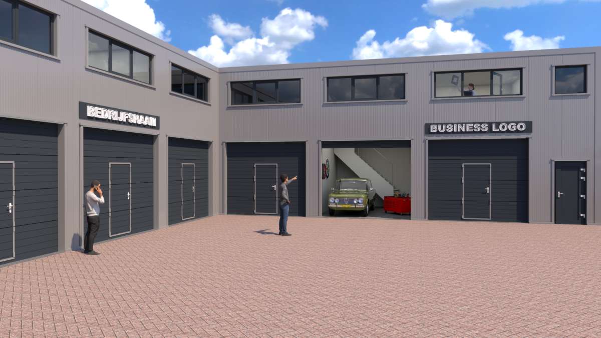 Er is ruimte voor gevelreclame boven de roldeur en op een gezamenlijk bord met uw bedrijfsnaam aan de straat. Verder is er een brievenbus aan het hek.